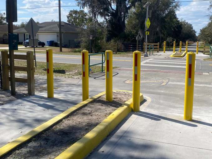 Apparently, the best efforts of county officials, law enforcement, surveillance cameras, and signage failed to resolve the problem. In response, Volusia County hired a contractor (?) to place bollards (concrete filled metal pipes) at the Courtland Boulevard crossing to physically prevent vehicular traffic from entering the trail.