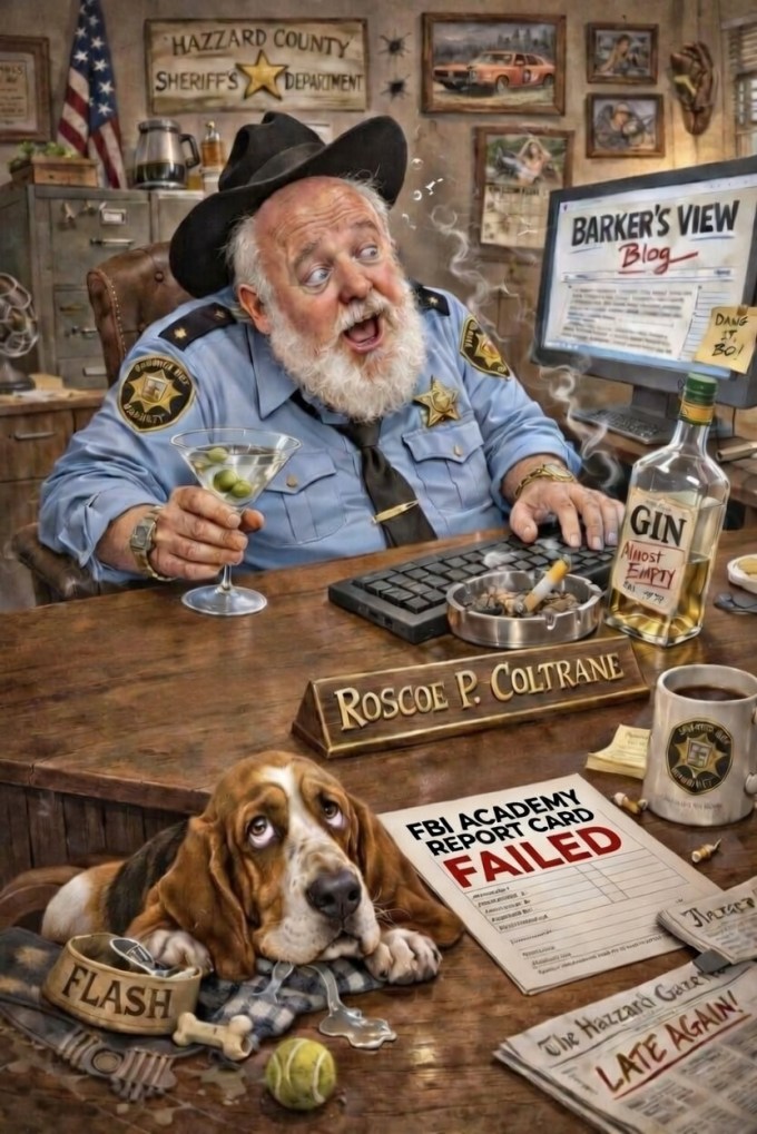 Looks about right to me! The “Hazzard County Sheriff’s Department” sign the “Barker’s View Blog” on the computer Flash the dog looking embarrassed at his owner’s work the failed FBI Academy report card the martini and gin bottle for inspiration and of course the nameplate “Roscoe P. Coltrane.”